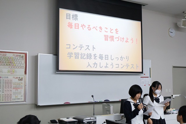 また、校友会代表生徒からはKnis運動についての連絡があり、「毎日やるべきことを習慣づけよう!」を目標として『学習記録を毎日しっかり入力しようコンテスト』を実施します。夏休みに習慣を守れなかった反省を生かし、生徒自身が企画したコンテストです。達成できるよう、みなさんが毎日意識して過ごしましょう。