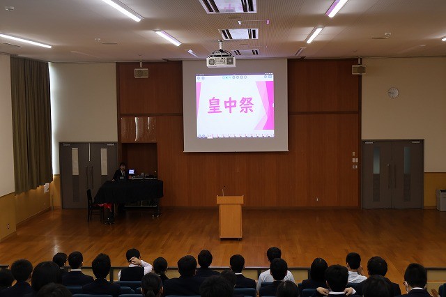 次に、校友会の先生から11月に行われる『皇中祭』についての連絡がありました。今年度の目標は『Let's Glow Up Together! ~心を一つに、今までの力を今、この時に~』です。みんなで力を合わせて、最高の『皇中祭』にしましょう。