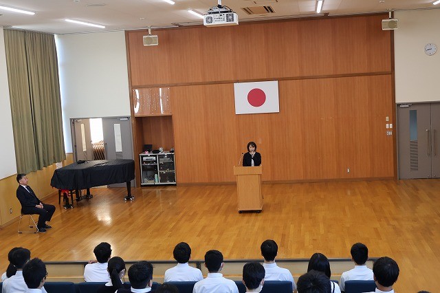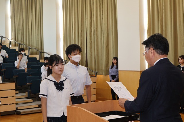 まず初めに、陸上の伊勢度会地区予選大会女子走り幅跳びで2位に入賞した生徒と伊勢市わが町写真コンクールで入選した3名の生徒の表彰を行いました。おめでとうございます。