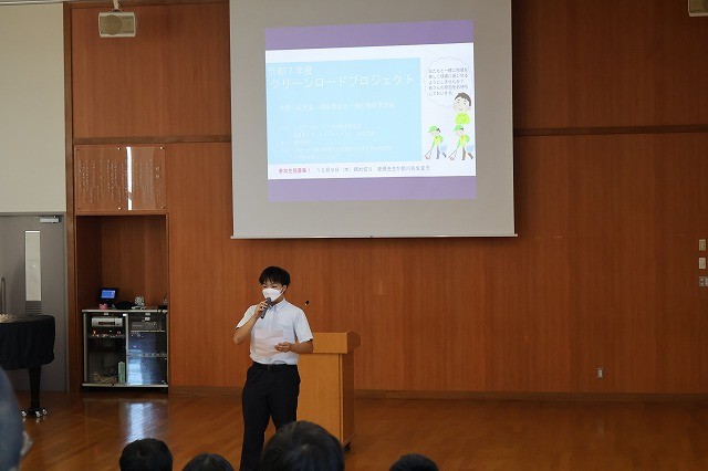 最後に校友会生徒から、『クリーンロードプロジェクト』についての説明がありました。普段通っている通学路を清掃する活動を行うことによって、地域貢献やSDGsにつながります。都合のつく生徒は、ぜひ参加してください。