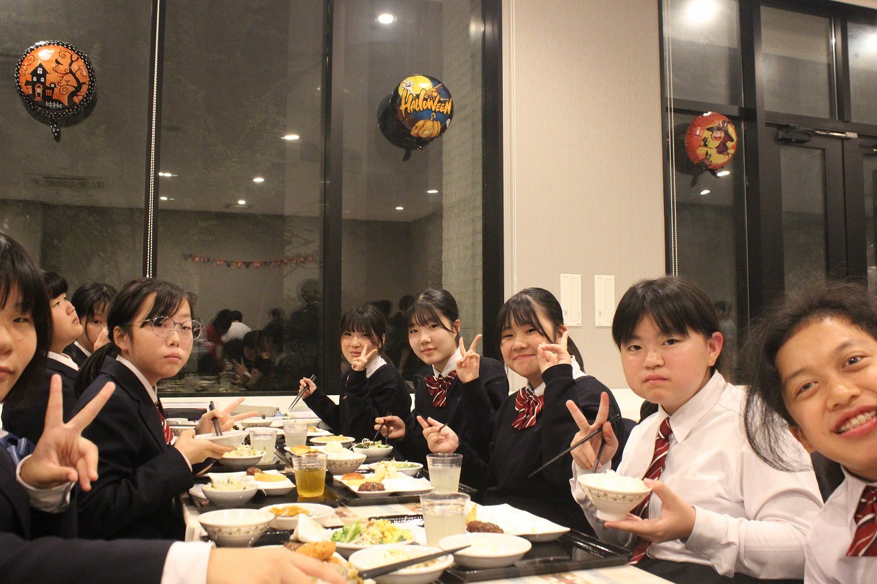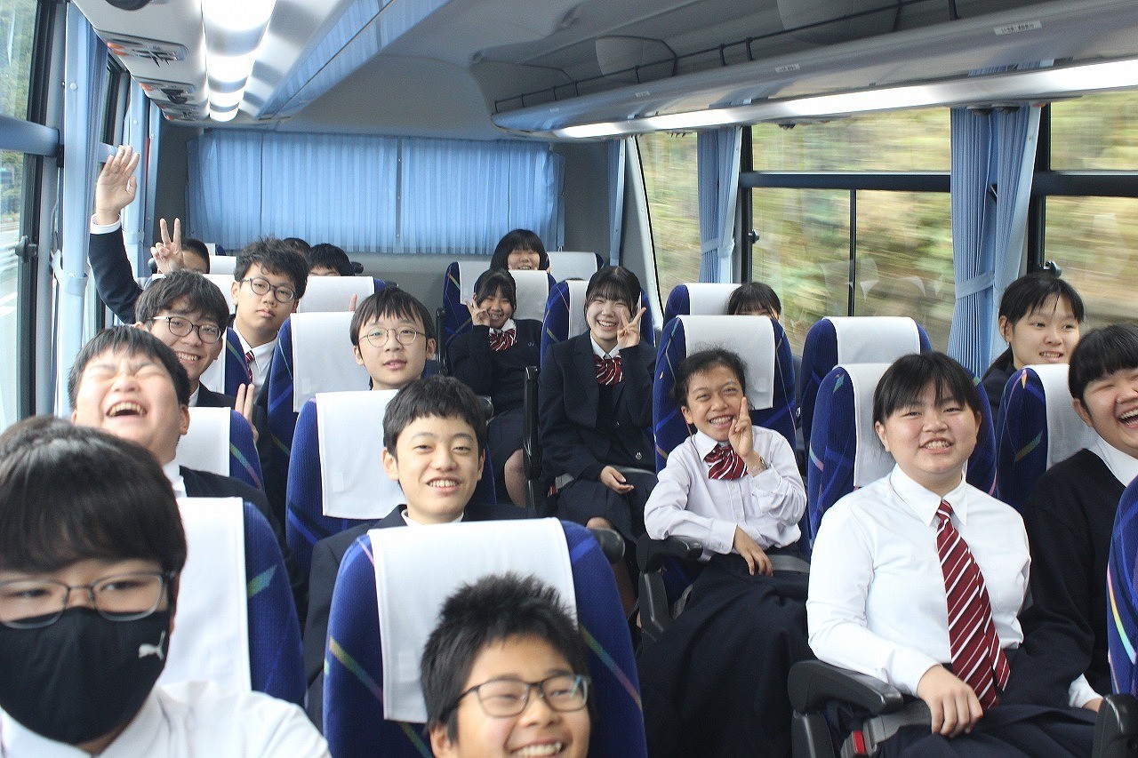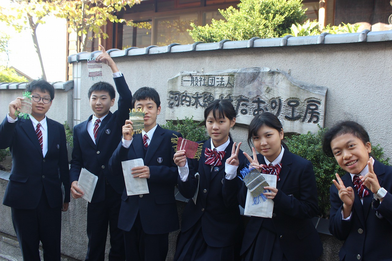 2年生の生徒たちが心待ちにしていた宿泊研修がいよいよ始まりました。少し肌寒い朝でしたが、天候に恵まれ、秋晴れのなか、参加生徒全員が元気に宇治山田駅に集合し、大阪に向けて出発しました!楽しみと期待で胸を膨らませた生徒たちがまず訪れたのは、ホテルセイリュウ。そこでは、「モノづくりのまち東大阪学講座~入門編~」というテーマで、大阪モノづくり観光推進協会表理事様に、東大阪の地理、歴史、産業、そして東大阪市が日本だけでなく、世界のくらしをも支えているモノづくりの町であることを教えていただきました。その後は、大阪市の風景を一望できる素敵なテラスで集合写真を撮り、美味しい昼食をいただき、モノづくり体験として、河内木綿はたおり公房様へ。そこでは、棉繰り、糸紡ぎの方法を教えていただきながら、オリジナルのコースター作り体験をさせていただきました。生徒たちはその技法に驚きを隠せず、夢中になって体験活動に取り組んでいました。また、そこで働かれている皆さんの、モノづくりと真剣に向き合う熱い気持ちのこもったお話は、生徒たちの心と記憶に鮮明に残ったように思えました。その後は、住吉大社に向かい、正式参拝を行いました。厳粛な雰囲気のなか、生徒一同心をひとつにし、日頃の感謝の気持ちを伝えて参りました。正式参拝後には、住吉大社のご祭神やご由緒について、分かりやすくお話をしていただきました。その後は、1日目最後の訪問先であるNHK大阪放送局へ。そこでは、日頃からテレビでよく見ているお天気キャスターやニュースキャスターの仕事を体験させていただいたり、実際にテレビで使われている様々な効果音の出し方などを知ることができました。生徒たちは、初めての体験に、目を輝かせ、楽しそうに取り組んでいました!その後は宿泊先のホテルに到着し、夕食を食べ、学習会(英語クイズなど)に取り組み、無事に1日目を終えることがきました。生徒たちにとって、とても楽しく、充実した、学びあり、笑顔ありの大満足な一日となりました!