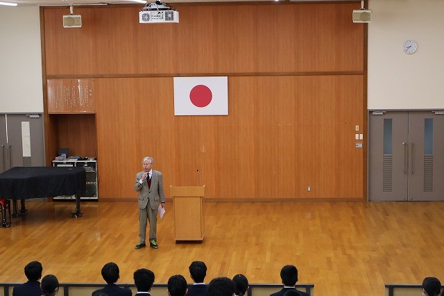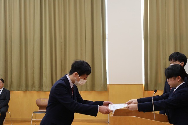 次に、校友会からKnis運動の表彰がありました。『毎日やるべきことを習慣づけよう!』という目標に対して、優秀な成績を上げた3年A組が表彰されました。12月の目標は、『やるべきことをしっかりやろう!』で具体的には、チャイムが鳴る前に着席し授業の準備がしっかりできているかが評価ポイントとなります。すべてのクラスが達成できるようみんなで声を掛け合い、全力で取り組みましょう。