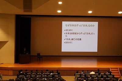 講演では、歴史的な背景を踏まえながら、国号が変わらずに「日本」であり続けた理由や、これからも日本であり続けるための心構えなどについて詳しくご教授いただきました。生徒たちは真剣な表情で耳を傾けていました。