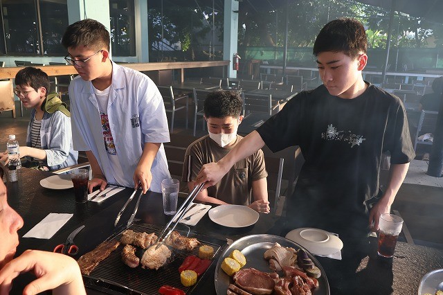 本日の夕食は、タモンビーチの夕日を眺めながら、ビーチに臨むテラスでのバーベキュー。おいしい料理を囲みながら、充実した一日の締めくくりとなりました。
